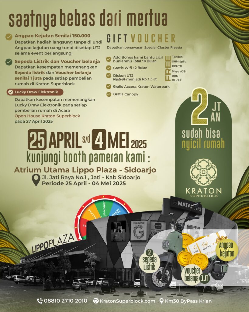 Buat kamu yang sedang mencari rumah idaman dengan Cicilan rumah 2 jutaan dan segudang bonus menarik, ini saat yang tepat untuk melangkah lebih dekat menuju kehidupan mandiri. Kraton Superblock menghadirkan pameran properti spektakuler bertajuk “Saatnya Bebas dari Mertua”, yang akan berlangsung di Atrium Utama Lippo Plaza Sidoarjo, mulai 25 April hingga 4 Mei 2025.